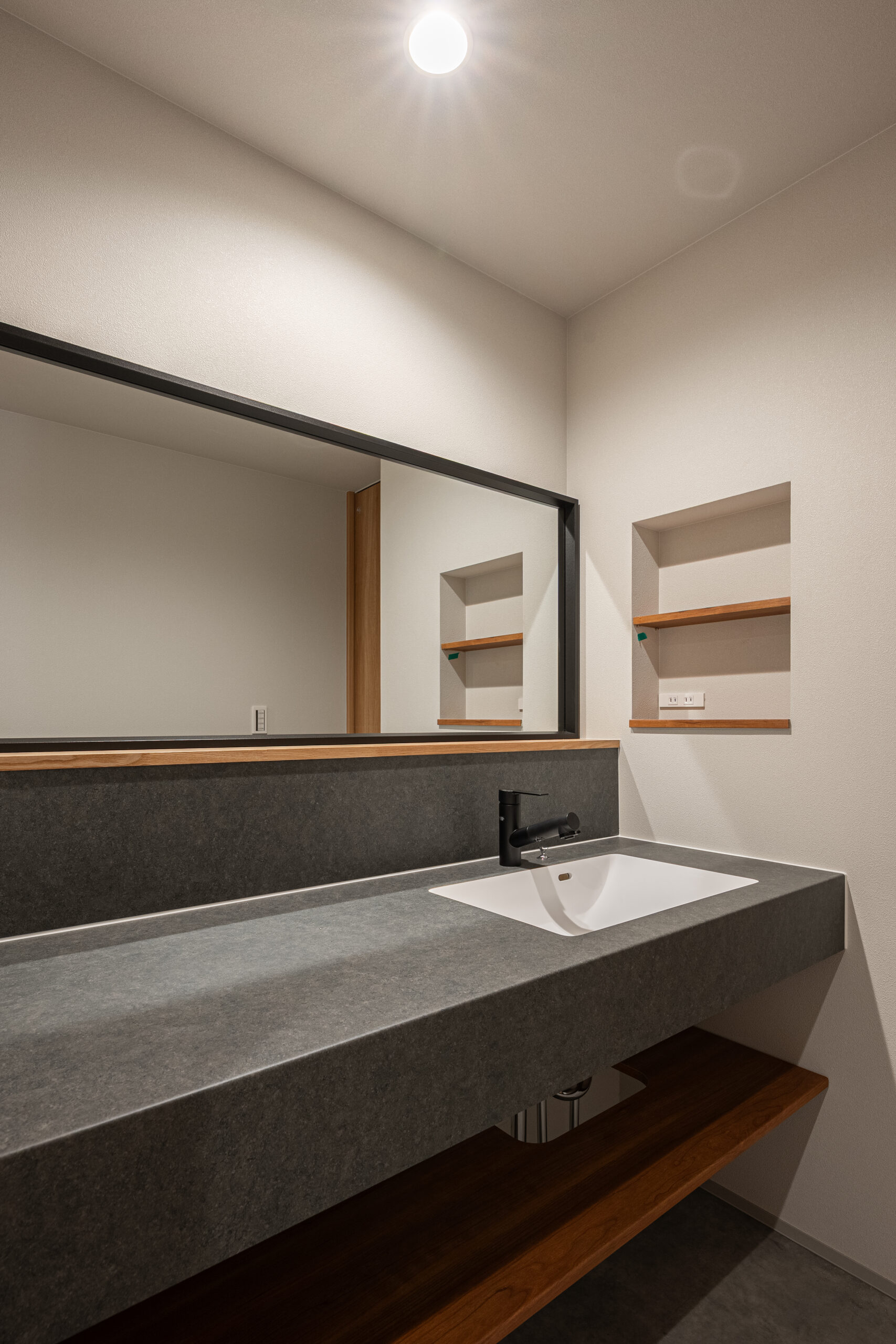 落ち着いた素材感でまとめた、洗面スペース。使いやすさと、心を整える時間を大切にしました。