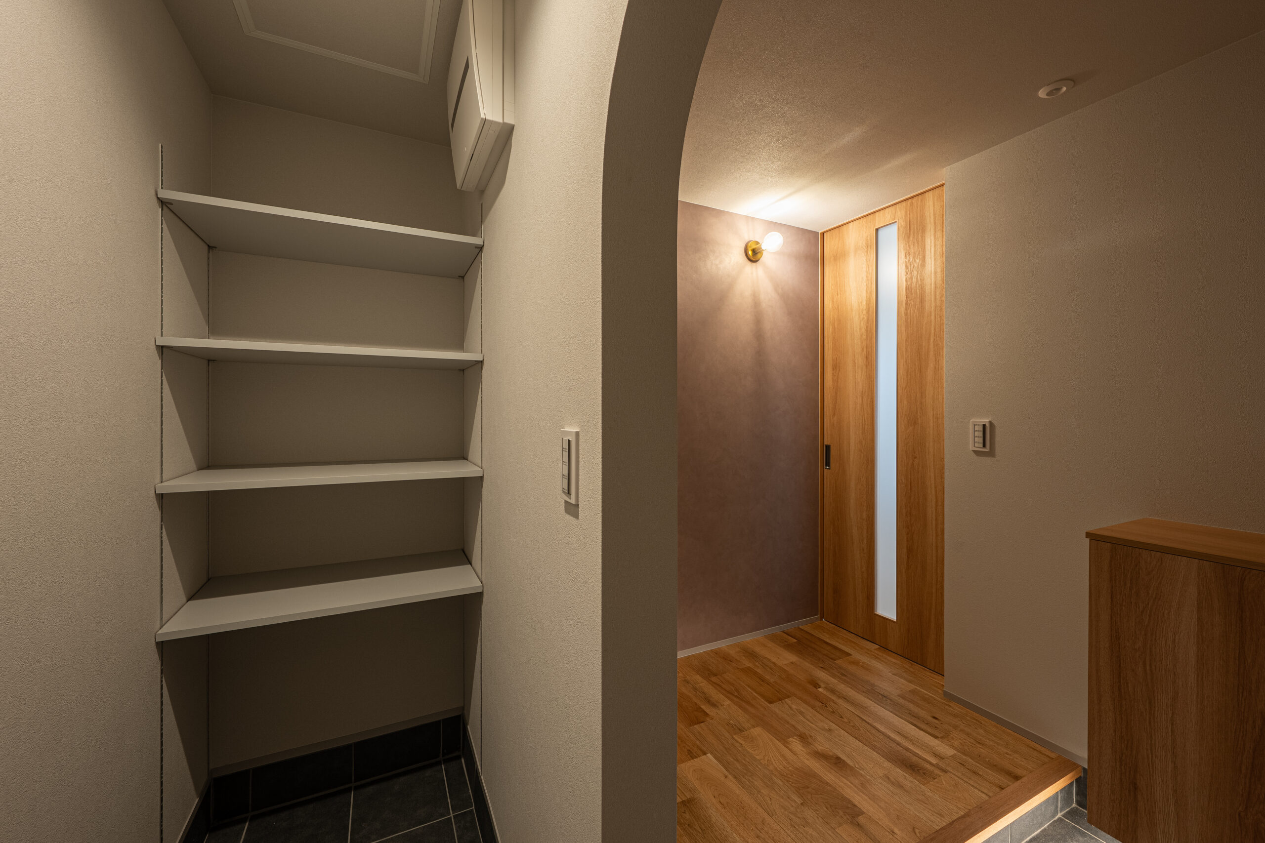 アーチの開口で、帰宅時にもやさしい落ち着きを感じられる玄関です。