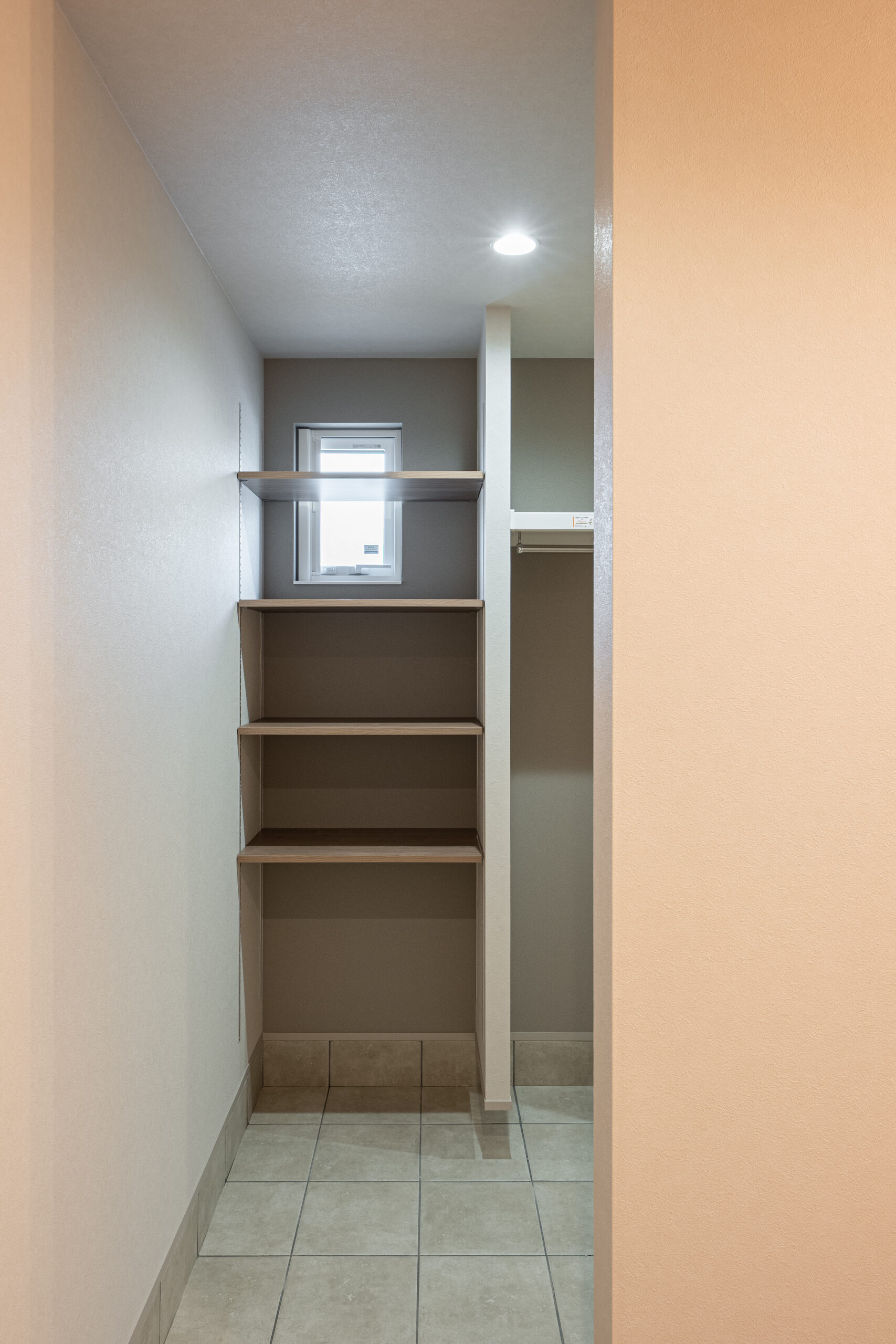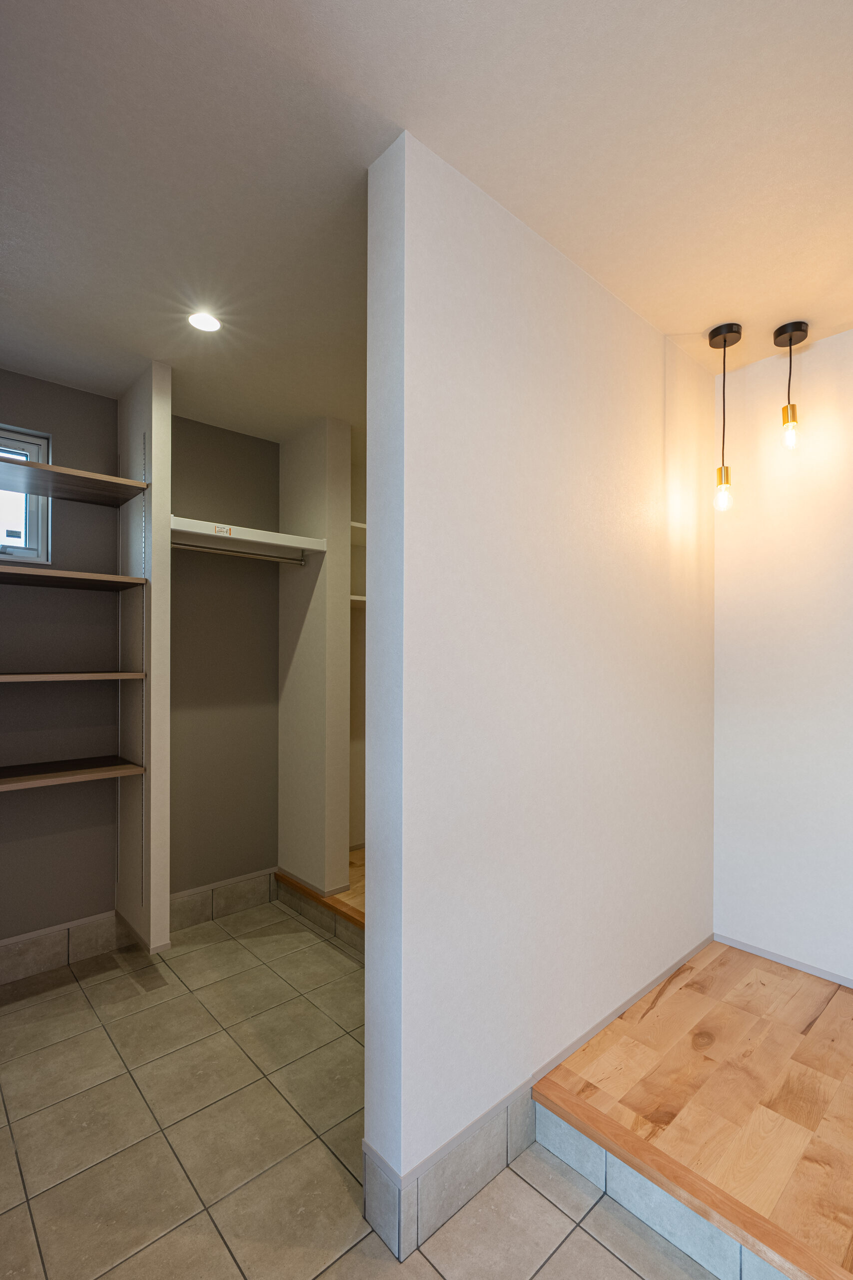 玄関はお客様用と分けた設計に。玄関収納を通り抜けるとパントリーへとつながり、買い物後の動線もスムーズです。