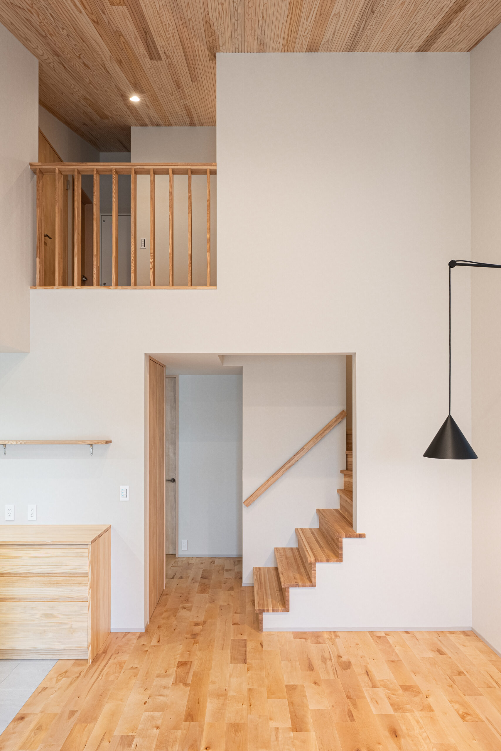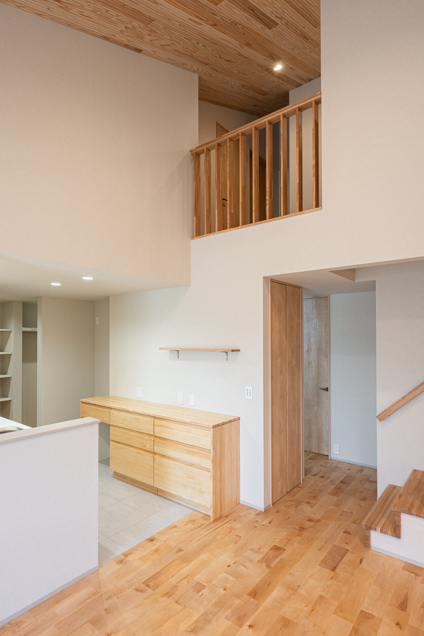 吹き抜けのあるリビングは、木のぬくもりと光に包まれた、のびやかな空間。