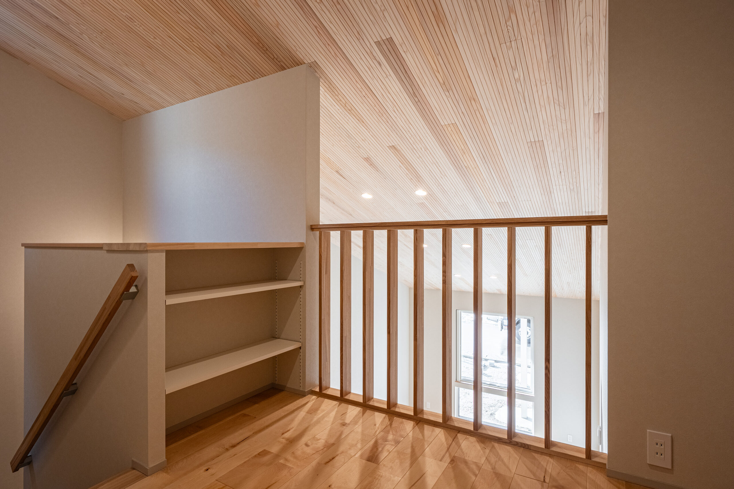 上下階がゆるやかにつながる、吹き抜けのそばのスペース。収納を設けることで、空間を無駄なく活かしています。